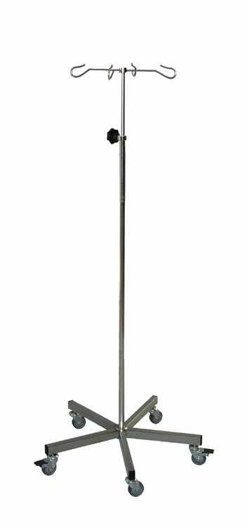 Infuzní celonerezový stojan na pětiramenném podstavci. Je určen pro operační sály, neboť má stabilní základnu se 2 brzděnými a 3 nebrzděnými vysoce kvalitními antistatickými pogumovanými kolečky o průměru 75 mm. Pro uchycení infuzních lahví je nutné zvlášť objednat košíček na infuze. Na přání zákazníka lze dodat nerezová kolečka. Příplatek za boční snímatelný nerezový košík /vnitřní rozměr 25x12x7 cm/ : 1.500,- Kč Zatížení háčku – 6 kg Nastavitelná výška 1250 - 2050 mm. Rozměry : 550x1250-2050 mm