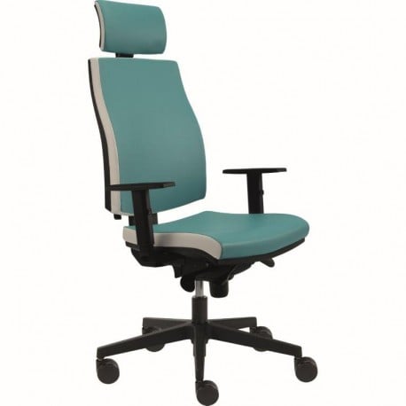 Židle určená do zdravotnictví, mechanika synchro, výškově stavitelný opěrák s aretací, prošití hran sedáku, opěráku i podhlavníku, sedák a opěrák z injektované pěny, nylonový černý kříž s kolečky pr. 65 mm, potah koženka, podhlavník stavitelný 3D, výškově stavitelné područky