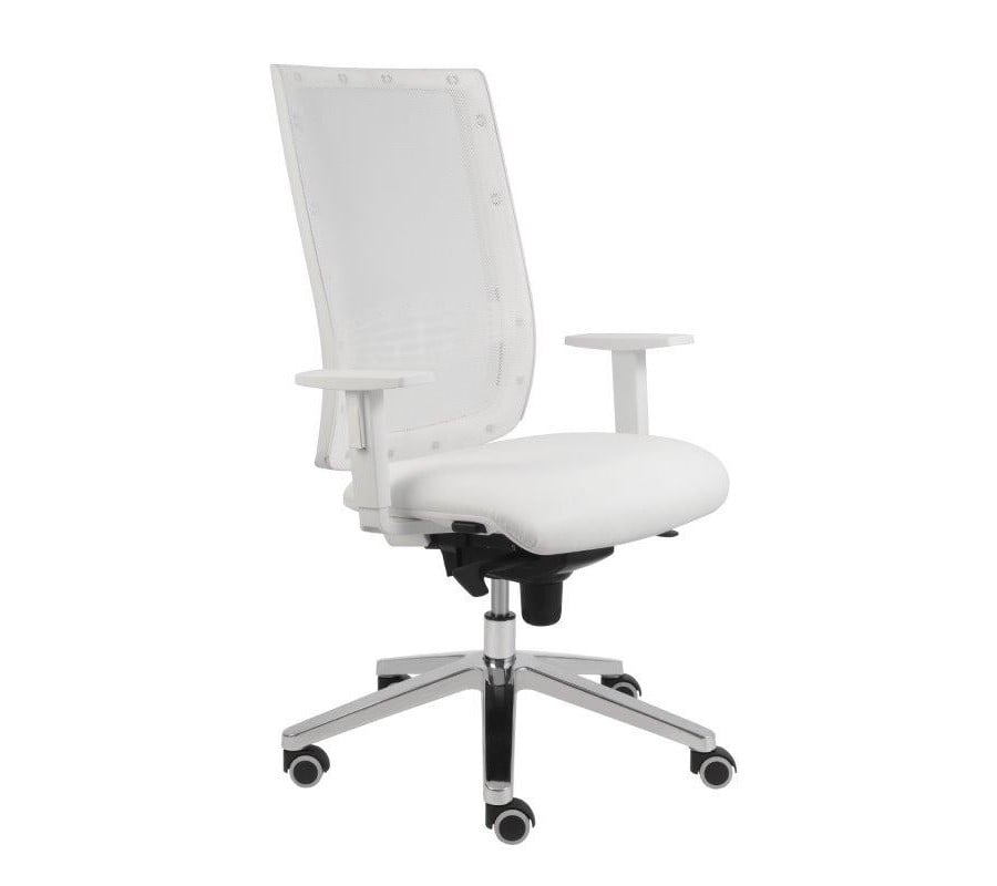 Síťové opěradlo, leštěný hliníkový kříž, výškově stavitelná bederní opěrka, výškově stavitelné područky kolečka pr. 65 mm plastová na měkký povrch, mechanika synchronní.