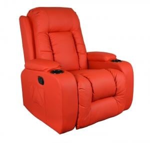 Relaxační křeslo mechanické - mechanické polohování pomocí páčky, masážní funkce zad, sedáku i lýtek spolu s vyhříváním v oblasti zad, možnost vysunutí podnožky do větší výšky oproti sedáku, houpací funkce, otáčení v úhlu 360°