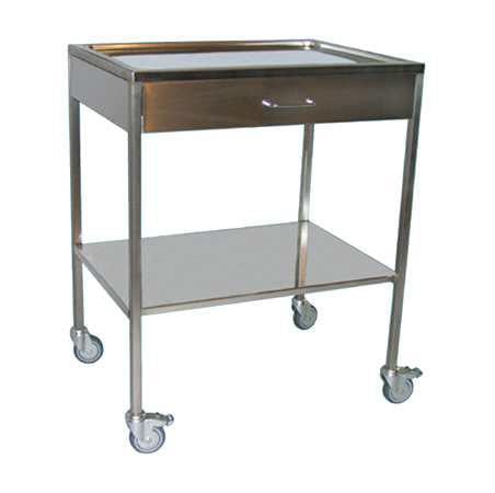 Nerezové provedení s vrchní lisovanou deskou se zaoblenými rohy a spodní odkládací deskou. Je opatřen zásuvkou pro odkládání přístrojového příslušenství. Vrchní deska může být vyrobena dle přání zákazníka z plastového nevodivého materiálu. Stolek slouží pro uložení přístrojů ve vyšetřovnách. Stolek je opatřen dvěma brzděnými a dvěma nebrzděnými otočnými kolečky Ø 75 mm.