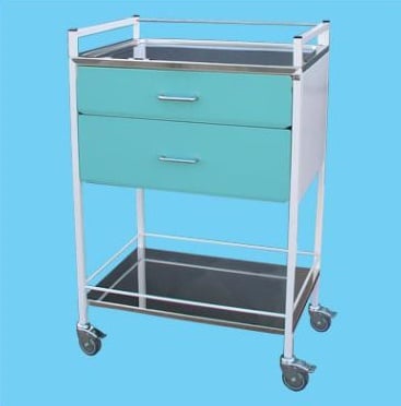 Skládá se z horního nerezového lisovaného plata se zaoblenými rohy, 2x zásuvky hl.100 a 200 mm a spodní část tvoří lisované nerezové plato. Stolek je opatřen dvěma brzděnými a dvěma nebrzděnými kolečky Ø 75 mm. Čela zásuvek mohou být v barvě RAL dle vzorníku za příplatek. Slouží k odkládání zdr. materiálu a na JIP odděleních.