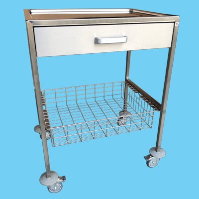 Pojízdný nástrojový stolek nerezový. Horní odkládací plochu tvoří nerezové lisované plato se zaoblenými rohy,zásuvka hl. 100 mm a ve spodní části je umístěn výsuvný nerezový vyjímatelný koš hl. 100 mm. Stolek je opatřen dvěma brzděnými a dvěma nebrzděnými kolečky Ø 75 mm. Slouží k odkládání zdravotnického materiálu.