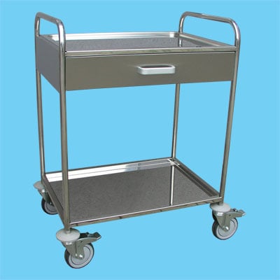 Pojízdný nerezový vizitový vozík je určen pro rozvoz zdravotnického materiálu a léků. Je vybaven jednou zásuvkou hl. 100 mm s plnovýsuvy, horním lisovaným a spodním vloženým nerezovým platem. Zásuvku lze na přání vybavit plastovou vložkou na léky PVZ-1. Stolek je opatřen dvěma brzděnými a dvěma nebrzděnými ložiskovými kolečky Ø 125 mm s gumovými nárazníky.