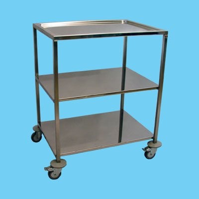 Pojízdný stolek nástrojový nerezový - SNN-3-640. Odkládací plochy tvoří tři nerezová plata, přičemž horní plato je lisované se zaoblenými rohy a spodní jsou rovná. Slouží k odkládání zdravotnického materiálu. Stolek je opatřen dvěma brzděnými a dvěma nebrzděnými otočnými kolečky Ø 75 mm. V případě požadavku je možné stolek vybavit antistatickými nerezovými kolečky. Možnost úpravy plat matováním pro laserová pracoviště. Vzdálenost mezi platy 300 mm.