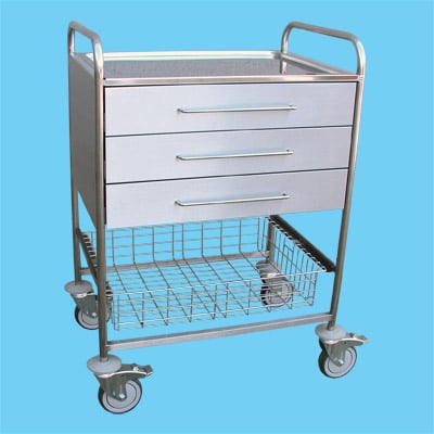 Pojízdný nástrojový stolek je vyroben z nerezových profilů a v horní části je opatřen dvěma madly. Odkládací plochy tvoří horní lisované plato, 3x zásuvka hl. 100 mm s plnovýsuvy a spodní oboustranně výsuvný nerezový koš hl. 120 mm. Stolek je opatřen dvěma brzděnými a dvěma nebrzděnými otočnými kolečky Ø 125 mm.