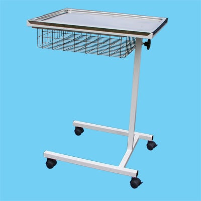 Výškově nastavitelný instrumentační stolek je vyroben z ocelových profilů, povrchově upravených práškovou polyesterovou barvou s vrchní nerezovou lisovanou deskou se zaoblenými rohy a výsuvným nerezovým košem hl. 100 mm. Je opatřen dvěma brzděnými a dvěma nebrzděnými otočnými plastovými kolečky Ø 50 mm. Je určen pro odkládání chirurgických nástrojů a zdravotnického materiálu. V případě požadavku je možné stolek vybavit antistatickými kolečky.