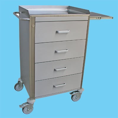 Stolek je vyroben z nerezových profilů s vrchním nerezovým lisovaným platem a ohrádkou, čtyřmi zásuvkami s plnovýsuvy hl. 200 mm, na levé straně s madlem a na pravé straně s integrovanou výsuvnou deskou pro zvýšení odkládácí plochy.
