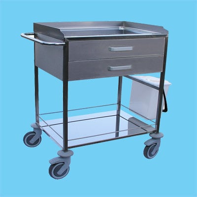 Stolek pojízdný je vyroben z nerezových profilů s vrchním nerezovým lisovaným platem s ohrádkou a spodním rovným odkládacím platem s ohrádkou. Je vybaven dvěma zásuvkami pro odkládání zdravotnického materiálu. Na pravé straně je zavěšen půlkulatý plastový koš. Stolek je opatřen dvěma brzděnými a dvěma nebrzděnými kolečky Ø 125 mm.
