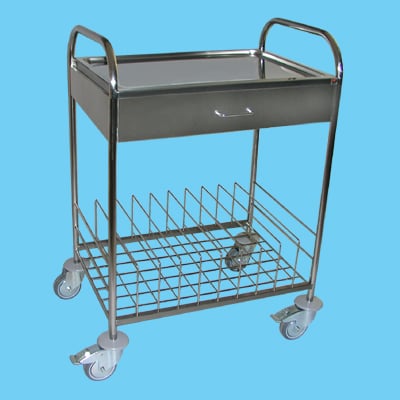 Pojízdný vizitový stolek je určen pro rozvoz zdravotnického materiálu a ukládání chorobopisů při vizitách pacientů. Je vyroben z nerezových profilů s horním lisovaným nerezovým platem , zásuvkou hl. 100 mm a ve spodní části je vybaven pořadačem. Stolek je opatřen dvěma brzděnými a dvěma nebrzděnými kolečky Ø 125 mm. Barva čela zásuvky za příplatek.