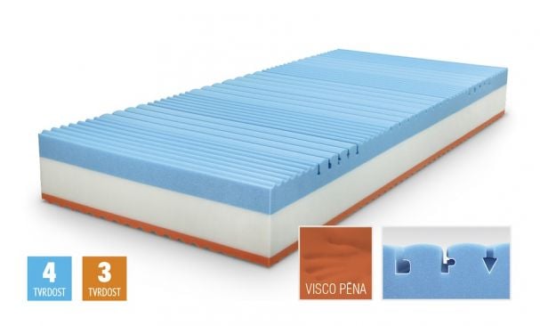 Kombinace kvalitních studených pěn a VISCO pěny zaručuje vysoký komfort spánku. Vrchní roznášecí Visco nabízí unikátní pocit při ležení z důvodu reakce této jedinečné pěny na teplotu lidského těla a dokonale se přizpůsobuje. Povrch jádra ze strany Visco pěny není rozdělen na zóny a matrace je tak vhodná pro spánek na břiše a pro lidi často měnící spánkovou polohu. Druhá strana matrace nabízí originální 7zónový prořez v oblasti ramen a pánve, který garantuje ideální ortopedické vlastnosti při spánku na boku a zádech. Matrace je vhodná na lamelový rošt pevný i polohovací. Vysoká životnost je zajištěná použitím kvalitních pěn. Matrace je vysoká 24 cm a je určena pro váhovou kategorii do 130kg. Potah - úplet - snímatelný na 2 poloviny, pratelný
